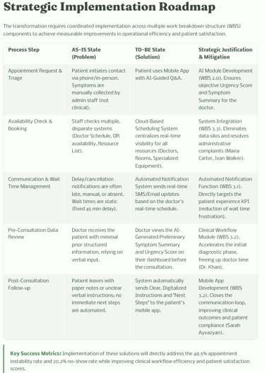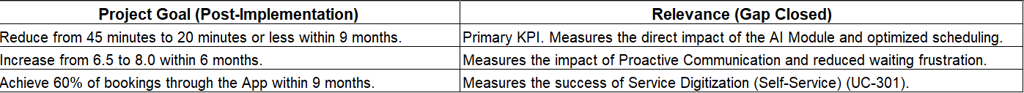 By focusing on these defined metrics, the project aims to recapture lost capacity equivalent to 10.2% of scheduled appointments and significantly elevate the Net Satisfaction Score (NSAT) from its current baseline of $6.5$. These objectives form the basis for the final Cost-Benefit Analysis (CBA) and ROI calculation.