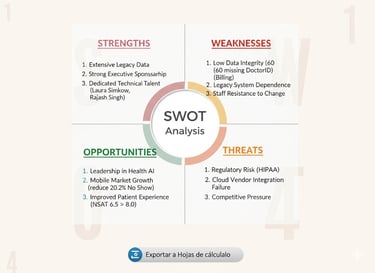 SWOT Validation: Protecting Strengths: The SWOT Analysis confirmed that transferring the HIPAA Risk (R05) allowed us to use the Strength (S3: Dedicated Technical Talent) to focus on the core AI/Scheduling goals, not regulatory certification.