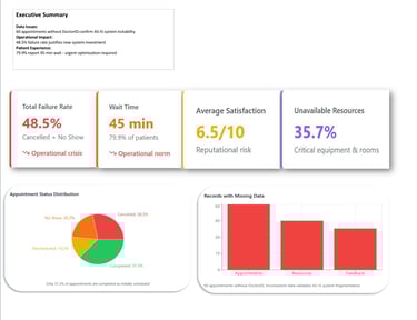 The healthcare industry faces mounting pressure to enhance operational efficiency without compromising quality of care. The hospital was suffering from a critical operational inefficiency driven by fragmented legacy systems and manual processes. The Business Pain (Validated by EDA): The current AS-IS system resulted in 79.9% of patients experiencing a 45-minute average wait time (validated by the feedback_data), and an appointment instability rate (Cancelled + No Show) of 48.5% (appointment_data). This instability directly led to lost clinical capacity and damaged the hospital's reputation (low NSAT score).