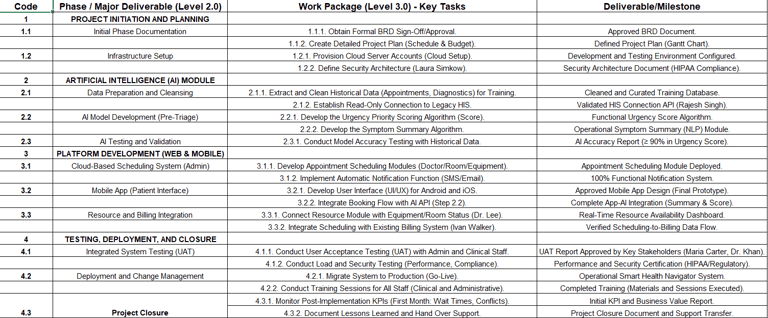 Change Management: Given the high risk of User Resistance (R03), I integrated the Change Management Plan into the WBS, ensuring dedicated resources for Role-Based Training and stakeholder buy-in before the Go-Live.