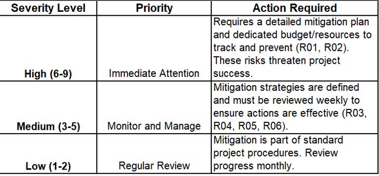 My strategic focus was on mitigating high-severity risks and ensuring clear project execution through structured deliverables:
