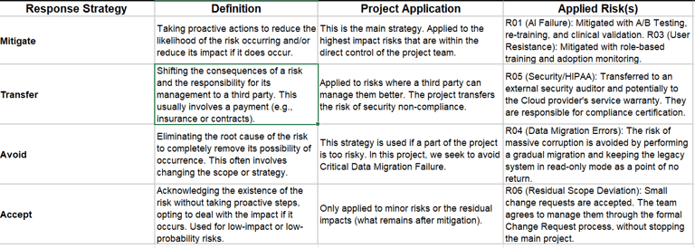 Risk Prioritization: I led the development of the Risk Management Plan, prioritizing the two critical threats (R01: AI Accuracy and R02: Legacy Integration) and formally defining the Mitigate, Avoid, Accept, Transfer strategies to proactively protect the project timeline and budget.